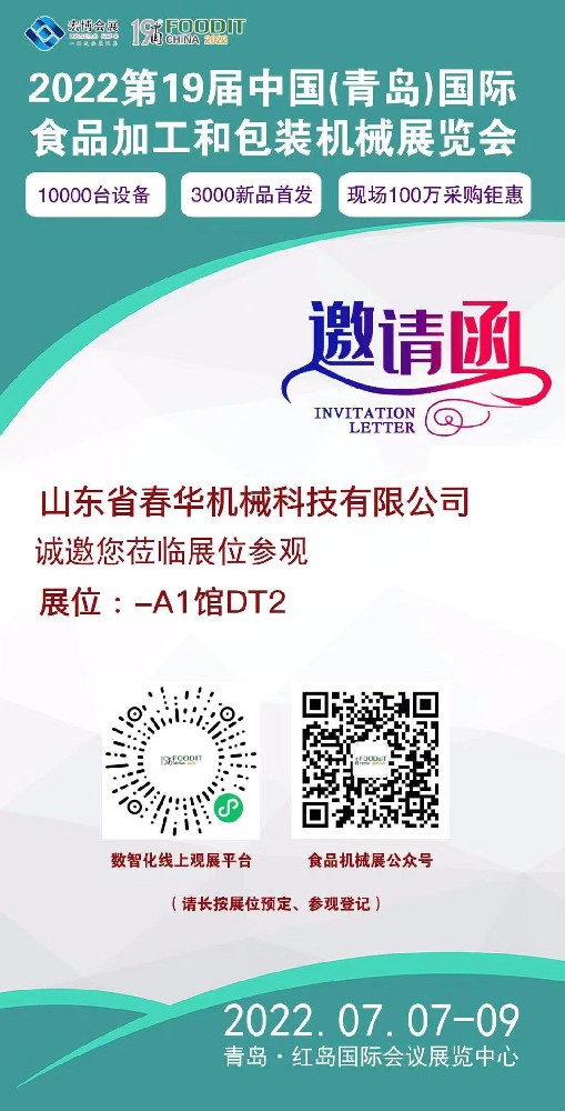 2022第19屆中國(guó)(青島)國(guó)際食品加工和包裝機(jī)械展覽會(huì)時(shí)間:2022.07.07-09展位號(hào):-A1館DT2…