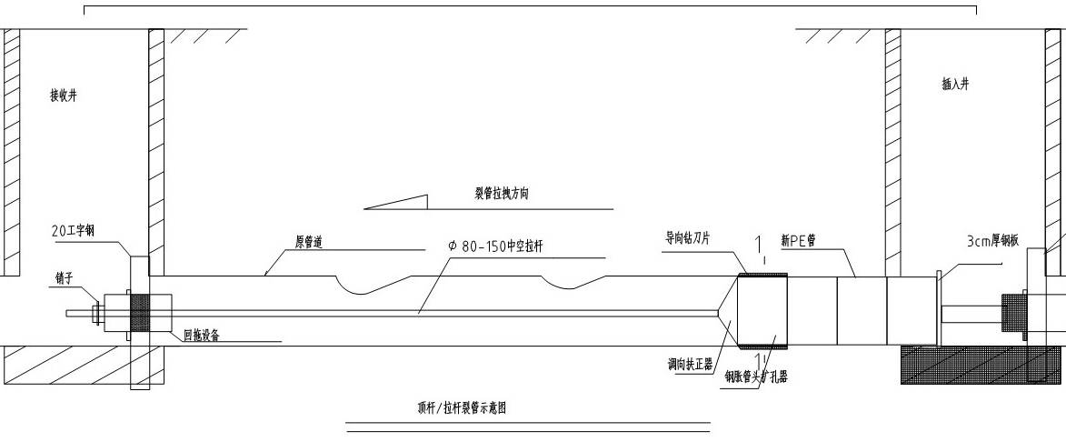 在導向拉桿回拖過程中,調向扶正器、導向鉆刀片、鋼脹管頭擴孔器處于管道前端,起到劃開舊管道,“開路”,的作用,在擴孔器的尾端連接戶PE管道,擴孔器的直徑要比舊管道的內徑略大一些,并且要比新管道的外徑要稍微大些,以便減少新管道進入的摩擦力,并且為頂進新管道留下一定的余地。同時,在擴孔器的尾端緊挨著新管道節段,新管道節段緊隨擠擴頭回拖。在導向拉桿的拖拉作用下擴孔器、新管道依次從插入并進入空腔并逐步向前推進,最終將整條管道更換。